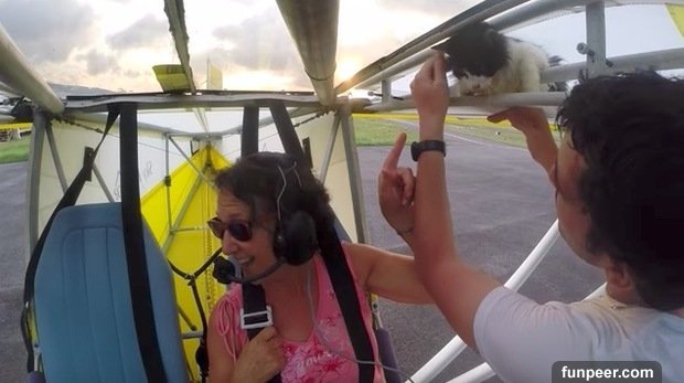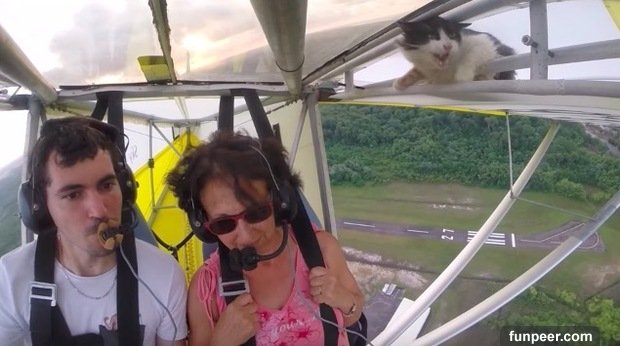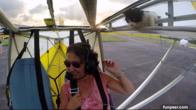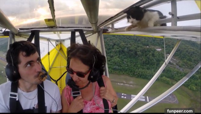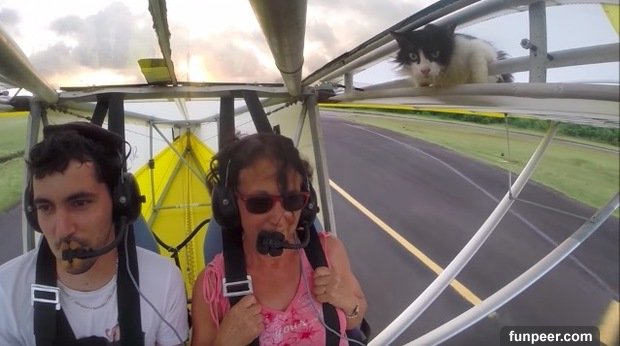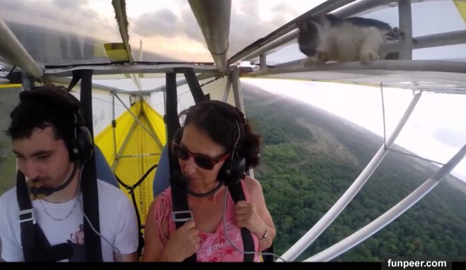 在天空中像鳥兒般,自由的翱翔,是許多人想做的事。有一隻小貓,似乎也有這樣的心願XD他就這樣隨著一架滑翔機,完成了一次有驚無險的空中之旅! 在法屬圭亞那,有位飛行員和女乘客乘滑翔機,飛上數千英尺高空,開始時一切都很正常,就像是平常時候的飛行一樣,但是突然鏡頭後邊,有一隻貓從機翼邊走了過來。很快飛行員就發現了這隻貓的存在,他既感到震驚又為貓的安全感到擔憂。飛行員於是選擇了立即降落,落地後將機翼上的貓抱了下來。小貓一直藏在機翼中,沒有被發現。