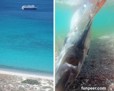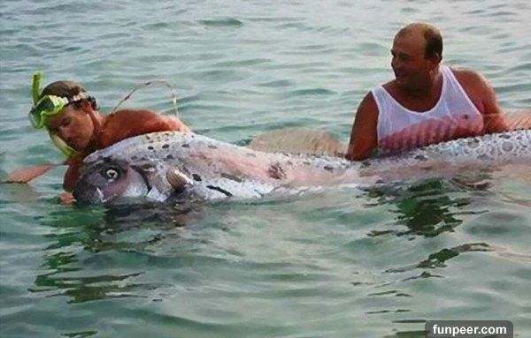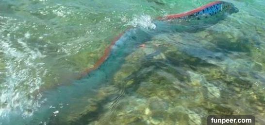 其中一隻在礁石旁停下來,露出銀白色的腦袋,頭頂長著紅色的鬃冠。這些特徵與傳說中的「龍王」極為相似。遊客們從未見過此物,紛紛驚慌失措地逃上岸!另外一隻在淺水海域,體態也清晰可見見,幾米長的背鰭呈紅色,自在悠閑地遊著。見如此稀罕物,幾個膽大的壯漢打算將其抓捕。