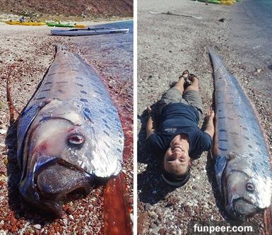快來看看有關地震魚的報導吧~皇帶魚(學名:Regalecusglesne),又稱龍宮使者、海龍王、白龍王、龍王魚、大帶魚、大鯡魚王、搖漿魚、地震魚,為輻鰭魚綱月魚目皇帶魚科的其中一種。分佈於深海、印度洋及太平洋,北緯72度至南緯52度的亞熱帶深海裡。皇帶魚是世界上最長的硬骨魚,體長最高可達11米,但普遍為約3米。而已知最重可達272公斤。由於捕獲數量稀少,科學家對其習性所知甚少。已知皇帶魚生活在深海的中、上層,過去以為它的游泳方式為波浪式的蛇行運動,但根據後來在墨西哥附近海域捕捉到的海底畫面顯示,