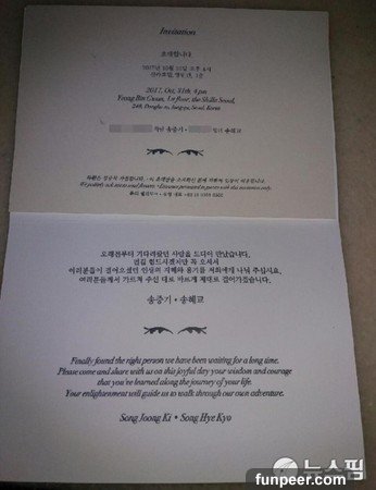 圖片來源:naver除了婚禮大方浪漫外,根據《ETNEWS星光雲》報導,兩人的喜帖也被韓媒曝光,採用典雅的白色,有著樸實的一番風味,上頭更寫下著「長時間的等待,終於等到對的人。」,象徵著兩人等待到對的愛情,也有印著印著「次子」宋仲基父母的名字,以及「獨生女」宋慧喬媽媽的名字,再用純白緞帶綁住封面,插著花草裝飾,超級唯美漂亮。