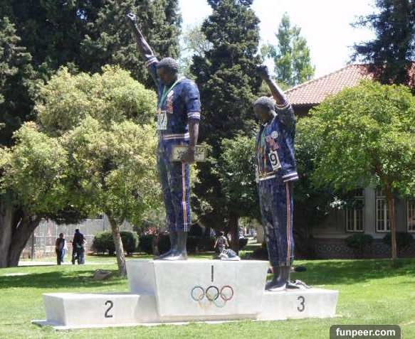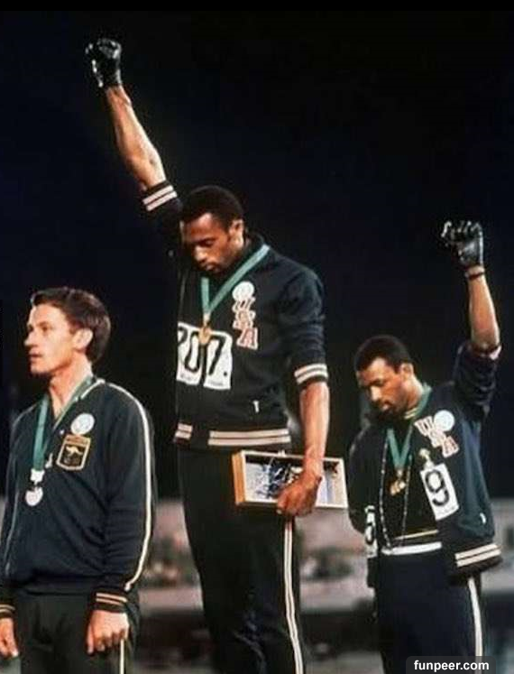 兩人突然舉起戴有黑色手套的拳頭,並垂下頭象徵對黑人權利致敬,這動作馬上引起輿論譁然,