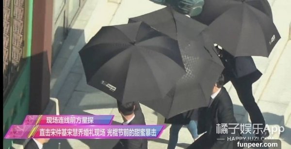 12 點 07, 新郎宋仲基已經和助理抵達了酒店 , 全程黑傘保護 , 保密程度一級 , 看不太清楚服裝 。