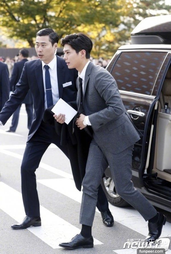 15點05,樸寶劍到達婚禮現場,一身灰色西裝也是很帥氣了!