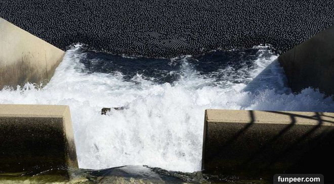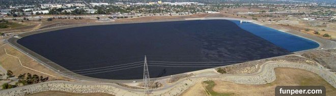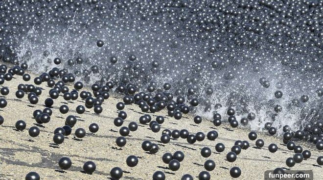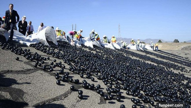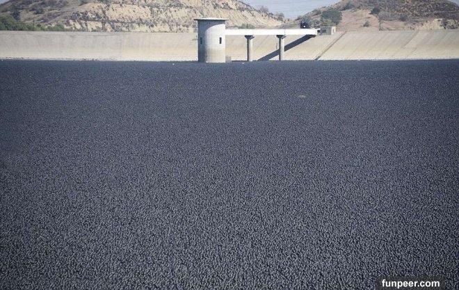 環保意識抬頭的現代社會,除了一般小市民隨手可做的不亂丟垃圾、垃圾分類等。公家機關、私人企業及政府機構也都漸漸重視這個議題,推出相關的措施。美國洛杉磯就有個成效顯著的方式,成功的保護水源。為了解決加州長久以來的乾旱問題,洛杉磯水電局把兩萬顆黑色塑膠遮光球,丟到洛杉磯蓄水池,這些聚乙烯材質的遮光球大約和蘋果差不多大,每個12元台幣,可以覆蓋水、防止水分蒸發並使水源不受灰塵、雨水、化學品和野生動物的干擾。 ▼水電局在希爾瑪(Sylmar)地區約75英畝大的蓄水池,放了9600萬遮光球,它們可以每年減少3億加侖的水分蒸發。這個蓄水池的水也有經過特別處理,原本用來淨化水質的氯和氯胺,用量降低,因為日光曝曬之下,其實會有可能導致致癌物質的產生。大部分人對於這樣的化學物質不會有什麼反應,可是有的人會感受到噁心、嘔吐、腹瀉和腹痛。