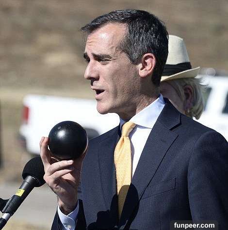 ▼市長艾瑞克(Eric Garcetti)也參與這次把小黑球放入水中的過程,預計成本為3450萬美元,比原本想要加蓋蓄水池的方案省下了三億美元。這項工作是一種創造性思維,具有一定的成本效益。