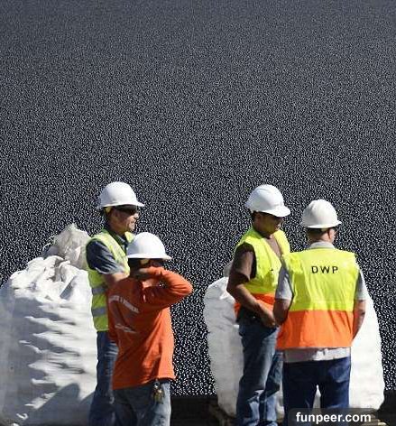 ▼這些球還形成一個保護屏障,可以隔絕鳥類、動物和其他汙染物。已退休的生物學家布萊恩博士(Brian White),是第一個想到用遮光球方式的人。這些小黑球一開始被放入水中時,出動了貨車。