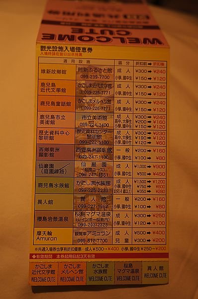 路面電車坐一趟是160,觀光巴士一趟是180,一日卷是600,櫻島渡輪一趟150,所以當然是要買welcome cute來用囉。而且有些景點門票還有小小折扣呢。