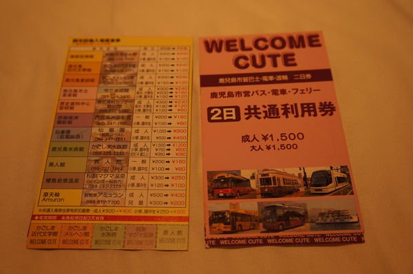 Welcome cute-這是想到鹿兒島旅遊的人最方便的旅遊卷。拿著它,就可以搭遍鹿兒島的主要交通工具。觀光巴士,路面電車,市營巴士,最好的是,還可以搭櫻島渡輪跟櫻島觀光巴士。還有一天只有一斑的周遊觀光船yorimichi cruise。這也實在太方便了吧!使用說明可以看這個