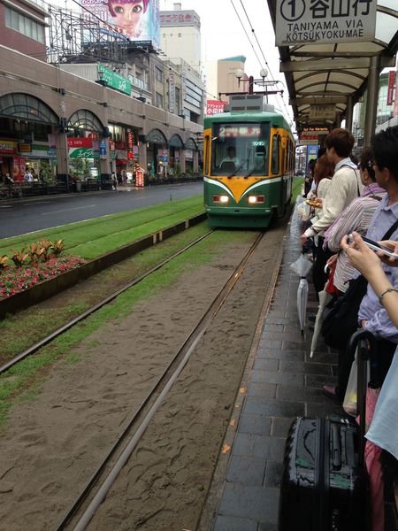 鹿兒島的路面電車很可愛,跟公車一樣,一個車廂,遇紅路燈會停,上下班人很多,就兩條路線而已,很簡單吧,但我們兩個還是坐錯了一次。因為天文館通是兩條路線都有到,但中央車站卻只有一條,好死不死我們就這樣錯了。連忙問了旁邊的乘客,雖然我們的英文他聽不懂,他的日文我們聽不懂,但最後還是知道我們坐錯了。哈哈。
