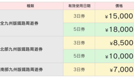 三、「全九州版」──5日鐵路周遊券: 18000日圓 / 每人