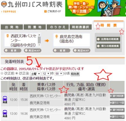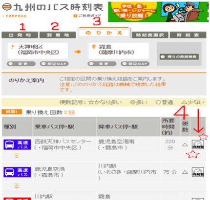 而公車及巴士的班次則能在 「九州巴士時刻表」官方網站上方便查詢。
