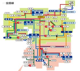 從「熊本」、「阿蘇」、「豐後竹田」到「大分」連一條線,分為北九州地區和全九州地區。