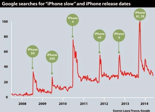 這位哈佛博士生Laura Trucco 在研究中分析了「iPhone變慢」的關鍵字發現,每當蘋果推出新款iPhone的那段時間,這類的關鍵字就會明顯增加;圖為「iPhone變慢」的關鍵字搜尋與iPhone新款推出時間比較。