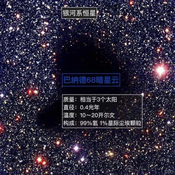這張照片由歐洲南方天文台旗下的甚大望遠鏡天文台(VLT)於1993年拍攝,采用可見光與近紅外圖像合成處理,顯示出來巴納德68就是漆黑一團。
