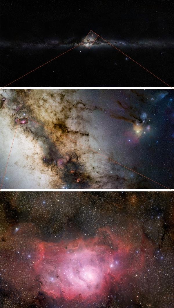 比如說,現在我們看到的礁湖星雲,就是由一片黝黑的暗星雲孕育而成。星際雲因密度不斷升高,引力坍縮最終形成新生的恆星群。彷佛,黑暗料理中吃出來的竟是星光燦爛……