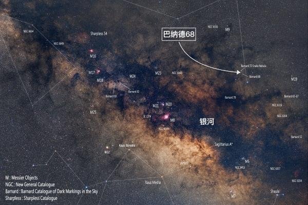 直到1919年,被美國天文學家巴納德(著名的巴納德星發現者)正式編入一本叫「暗星雲總表」的天文列表裡,排在第68位,由此得名——巴納德68(Barnard 68),簡稱B68。