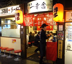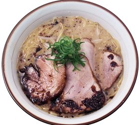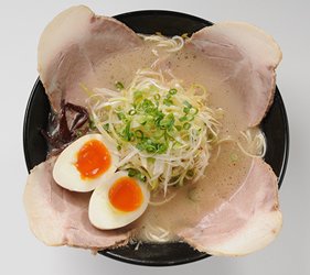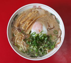 大大的叉燒片鋪在拉麵上,整體完全展現出豬骨最原本的「鮮」和「甜」,濃郁的程度有如像加入了奶油一樣濃厚,吃下去時瞬間覺得豬骨精華全都在嘴裡了!而且還搭配了特製的細麵條,讓口感更為滑順好入喉!湯底還混合了福岡本地的3種醬油與6種魚貝類的高湯,讓口感更有層次,喜歡濃郁口味的人務必嘗嘗!