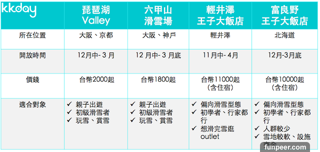 最後KKday 也為大家做了張小表格,讓大家可以更清楚知道哪個滑雪場較適合自己,另外也提醒大家滑雪場的開放時間,出發前可以再查詢一次確認。