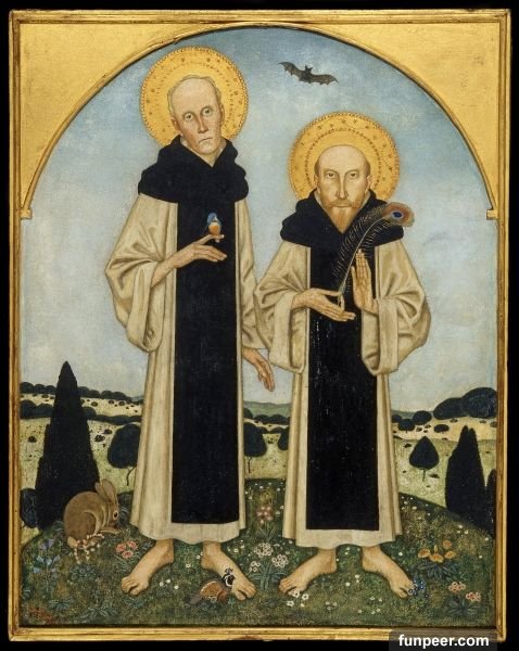 ▼3.Edmund Dulac的畫作《Charles Ricketts and Charles Shannon as Medieval Saints》,他利用其中一名僧人手上拿的孔雀羽毛,暗示在全為男性的環境中,男人與男人之間互相仰慕的情愫。