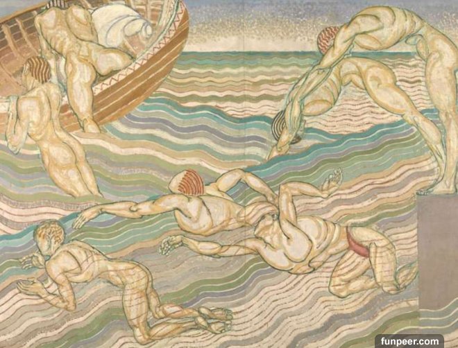 ▼9.Duncan Grant的畫作《Bathing》,畫作中有7名裸男,其中2名正爬上一艘傾斜的船上。Grant曾與他的表親Lytton Strachey、經濟學家約翰·梅納德·凱因斯、探險家喬治·馬洛裡都傳出過曖昧關系,但最終與Virginia Woolf的姊妹結婚。