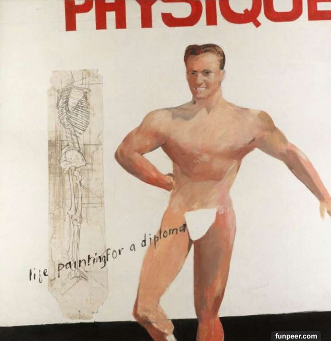 ▼6.David Hockney的畫作《Life Painting for a Diploma》,畫作中的裸男取自於美國健身雜志《Physique》的封面,後方的人體解剖圖則是Hockney在進入皇家藝術學院後不久所畫的。