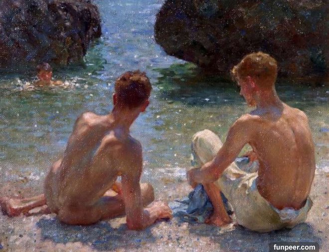 ▼5.Henry Scott Tuke 的畫作《The Critics》,在這幅畫中,有兩位赤裸的年輕男子坐在沙灘上,與在水中的第三名男子談天歡笑,暗示了幾名年輕男性之間的若有似無情愫。