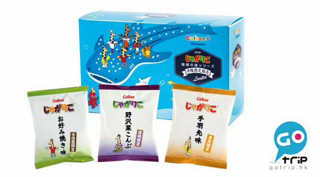 這是沖繩限定包裝款,藍色包裝象徵海洋,光是包裝已經充滿沖繩特色。盒內有8包不同口味的薯條,有關西的章魚燒風味,東北的帆立貝燒烤風味等。
