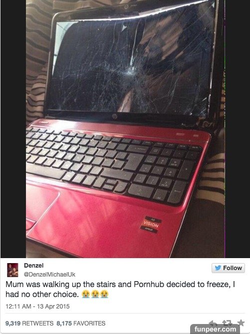 「我媽突然走上樓但是Pornhub (色情網站) 剛好當機動不了,於是我沒有其他的選擇了...」