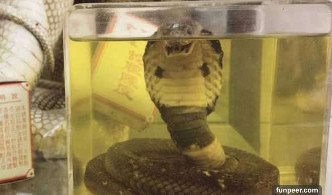 ▼過了一個月,他想要品嘗自己泡制的蛇酒,就將酒瓶開封,沒想到裡面的眼鏡蛇竟然還沒死,還向他咬了一口。