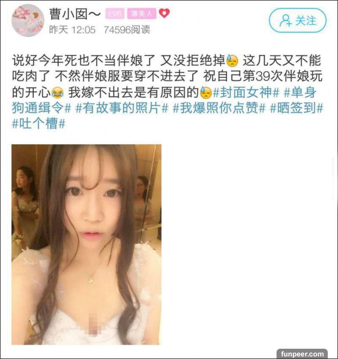 ▼最近又要做伴娘,曹小囡忍不住在社群網站上調侃說:「說好今年死也不當伴娘了,又沒拒絕掉。祝自己第39次伴娘玩的開心,我嫁不出去是有原因的……」有人說女孩子最多做3次伴娘,超過3次就嫁不出去了。不過曹小囡不信這些,她認為「遇上對的人哪怕再等久一點,當再多次伴娘又如何,唯一不好的就是伴娘吃不上熱菜。」