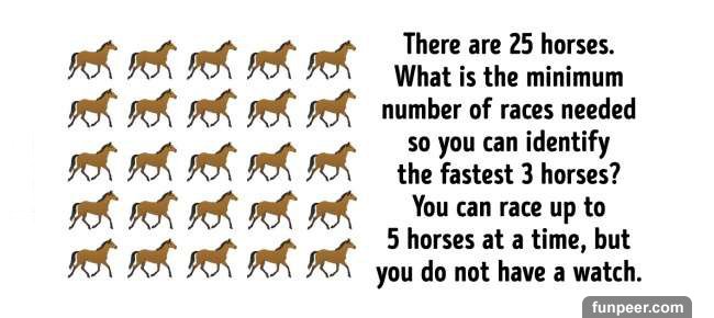 ▼Google面試題:賽場中有25隻馬,5條賽道,也就是說一次可以有5隻馬一起比賽。你沒有手錶,最少比幾次才能找出跑得最快的3隻馬?