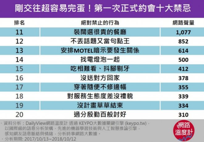 今日DailyView網路溫度計透過《KEYPO大數據關鍵引擎》從2017年10月13日到2018年10月12日一年間觀察網友在臉書討論、PTT與各新聞媒體、討論區,統整出「交往後第一次約會禁忌」排名,讓你/妳約會不踩雷,幸福到永遠!