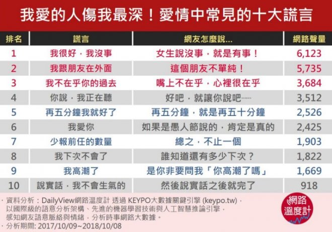 那麼,這些話,到底是為了維持感情不得不的「善意謊言」,還是「渣男渣女慣用的伎倆」?今DailyView網路溫度計透過《KEYPO大數據關鍵引擎》來調查網友們最常遇見的十大愛情謊言,男女都適用,讓你一招識破他/她的甜言蜜語!