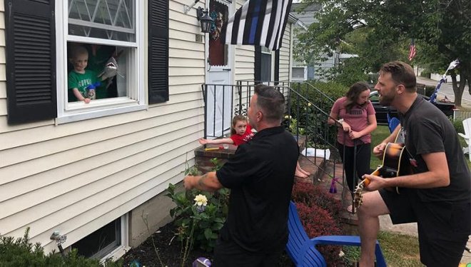 不僅如此,還有人拿著吉他到奎因家門口自彈自唱表演給他聽,這扇窗戶外面的草地儼然變成了一個小小舞台!