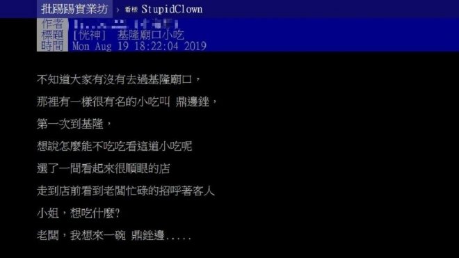 這名女網友在社群平台「PTT」發文說,「不知道大家有沒有去過基隆廟口?那裡有一樣很有名的小吃叫鼎邊銼,第一次到基隆,想說怎麼能不吃吃看這道小吃呢?」接著她就選了一家看起來順眼的店家,走過去的時候老闆親切地問:「小姐,想吃什麼?」結果當下不知道是腦筋打結還是舌頭打滑,她竟然講出超害羞的話!