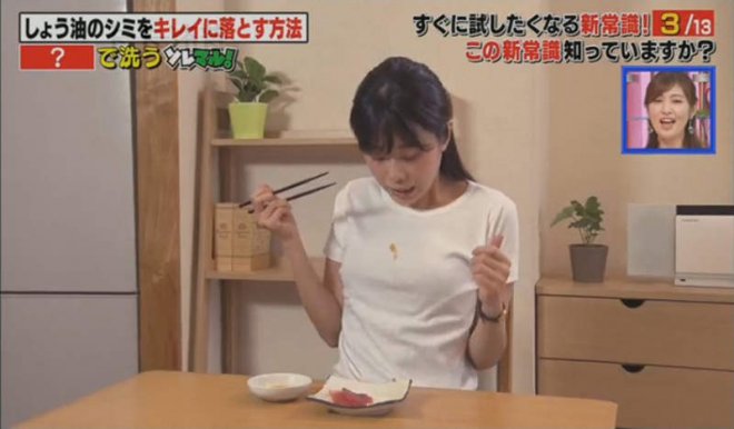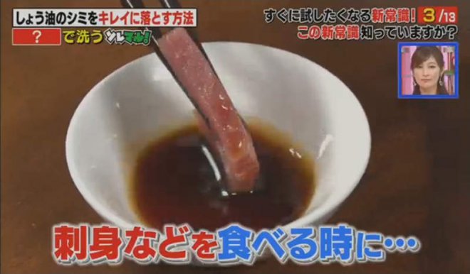 圖片來自:電視截圖前陣子本魚介紹了如何讓領口鬆垮垮的T恤復活,現在又有一個關於衣服的家事妙招要告訴大家!吃生魚片之類需要沾醬油的時候,大家曾不曾經不小心滴到衣服上呢?醬油漬經常被認為是非常難以清除的污漬,尤其是滴到