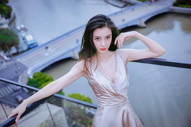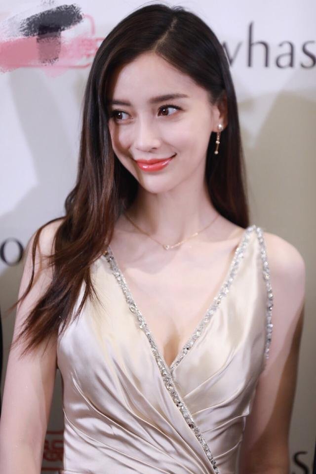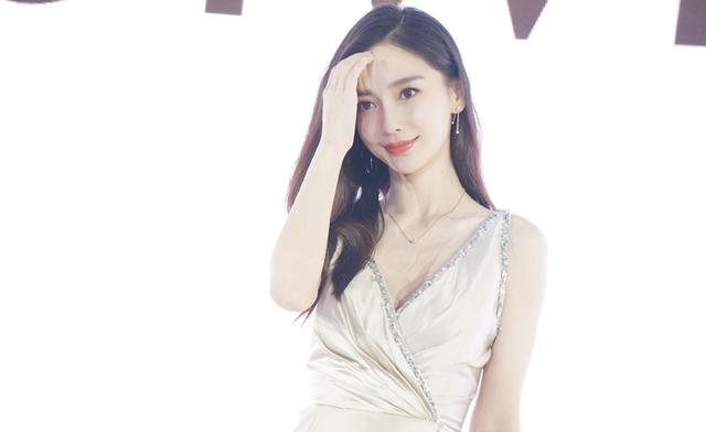 angelababy今天身穿一襲香檳金弔帶長禮服,這套禮裙襯的baby的膚色十分白哲。