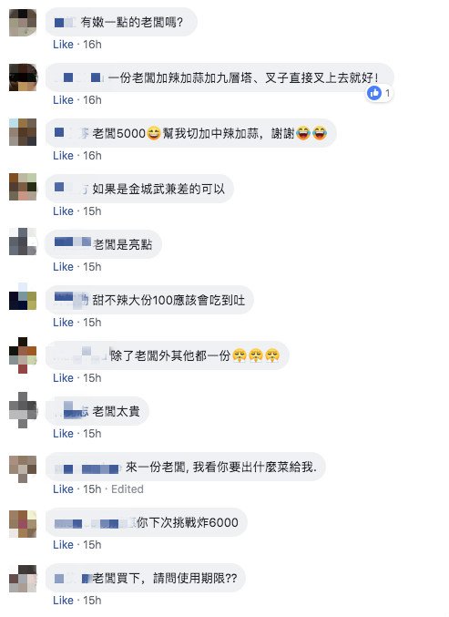 創意又搞笑的照片曝光後,許多網友都紛紛笑回,「是一晚5000?」、「點老闆,吃終身」、「老闆是用炸的還是用滷的」、「來一份老闆,炸酥一點,大辣去骨,謝謝!」另外也有人歪樓表示,「好想知道老闆可不可口」、「想看老闆張相」、「有老闆娘可以點嗎?XD」、「跪求老闆照片」。不過原PO最後也回覆,要大家別問她老闆長怎樣,因為是朋友去買的,所以她也不知道。