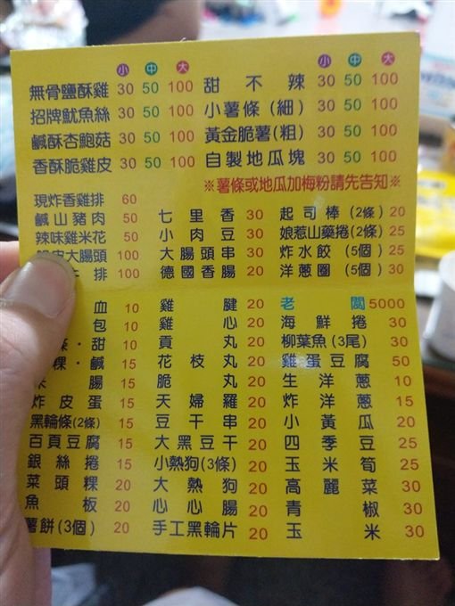 根據《三立新聞網》報導,有位女網友在臉書「爆廢公社公開版」中分享自己購買鹹酥雞的有趣經驗,只見她PO出了一張菜單照片,上面林林種種地寫滿了許多炸物品項,例如經典的無骨鹹酥雞、魷魚絲、甜不辣等,光是用看的就讓人忍不住口水直流,更不用說菜單上的價格也非常實在。但是在一堆密密麻麻的字裡,有一行是用淺藍色寫著「老闆」二字,而且一看價格,竟然高達5000元,這是真的要把老闆賣了嗎?