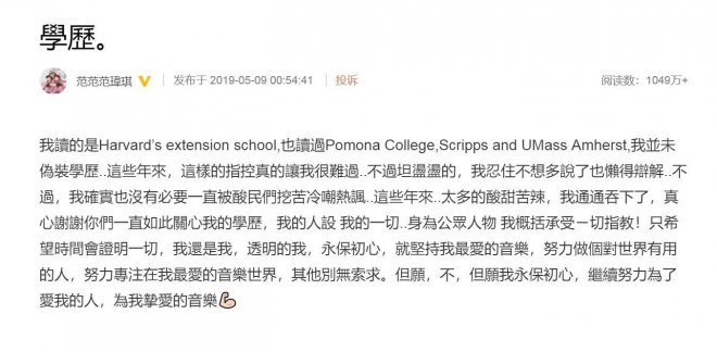 對此,她則是在微博澄清,表示自己「並未偽裝學歷」,自認從頭到尾都是坦蕩蕩的,不想再多說、也懶得再辯解,「這些年來來太多酸甜苦辣,我通通吞下了,希望時間會證明一切。」如今,她的老公「陳建州」終於出面,日前在節目《叫我神隊友》中提到了這件事,「范范家其實不是那麼富有,不能同時供她跟弟弟在美國唸書,但她在那時候剛好找到了自己喜歡做的事情,就是唱歌,所以乾脆休學回台發展了。」