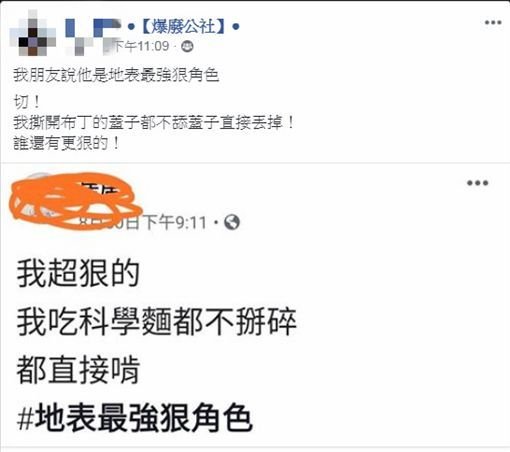你是「狠角色」嗎?有網友在臉書開嗆,表示自己看到朋友說「我超狠的,我吃科學麵都不掰碎,都直接啃」,並標註「#地表最強狠角色」,因此他就好奇,還有誰會比他們更狠,便在《爆廢公社》中PO文嗆聲「我撕開布丁的蓋子,都不舔蓋子直接丟掉!誰還有更狠的」。無厘頭的搞笑貼文,意外引發話題,也釣出許多鄉民分享自己的「兇狠」事蹟,讓網友看了全都笑翻。