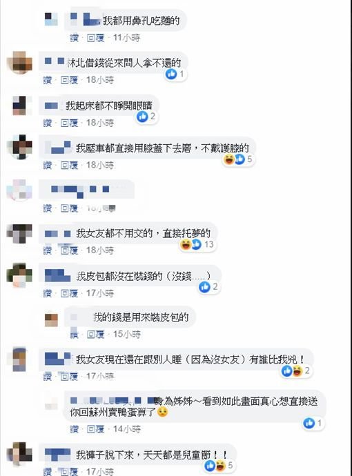許多「狠角色」看完貼文後也都按捺不住,紛紛留言反擊,說出無厘頭的爆笑舉動「我買冰沙都不要冰」、「我吃肉包都只吃皮」、「我大便都不擦屁股」、「我喝珍奶都不吃珍珠」、「我吃茶葉蛋都直接吃,沒在跟你剝蛋殼的」、「我褲子脫下來,天天都是兒童節」、「我吃完洋芋片,不舔手指頭」、「我吃魩仔魚都去骨去鱗片」、「我用指甲刮玻璃、刮黑板都不捂耳朵的!夠狠吧」。