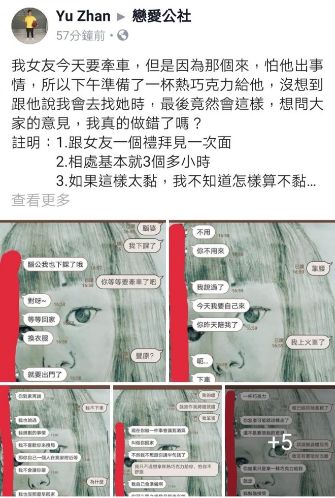 我女友今天要牽車,但是因為那個來,怕他出事情,所以下午準備了一杯熱巧克力給他,沒想到跟他說我會去找她時,最後竟然會這樣,想問大家的意見,我真的做錯了嗎?註明: 1.跟女友一個禮拜見一 次面 2.相處基本就3個多小時