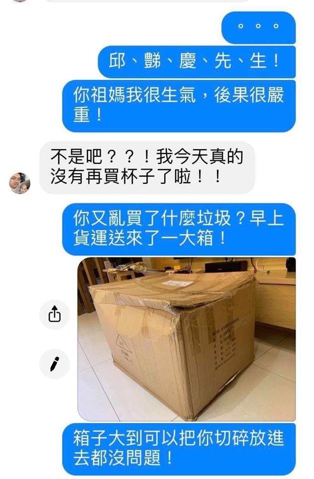 邱豑慶醫師在自己的粉絲專頁貼出和老婆間的對話紀錄,只見老婆在對話中氣憤的說:「邱、豑、慶、先、生!你祖媽我很生氣,後果很嚴重」,而邱醫師也慌忙解釋:「不是吧?!我今天真的沒有再買杯子了啦!」接著老婆傳來一個大箱子,質問:「你又亂買了什麼垃圾?早上貨運送來了一大箱!」老婆更氣得直言:「箱子大到可以把你切碎放進去都沒問題!」