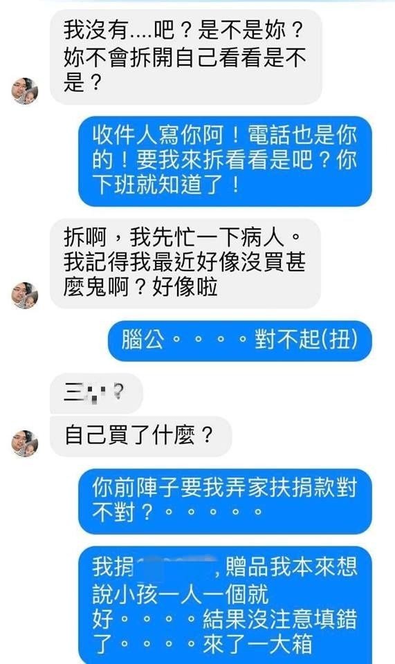 不過邱醫師一頭霧水,因為自己根本沒有買東西,因此叫老婆拆開,老婆也怒回:「收件人寫你啊!電話也是你的!要我來拆看看是吧?你下班就知道了!」沒想到才剛撂下狠話,老婆突然態度180度大轉變,回應:「腦公…對不起(扭)」,讓邱醫師超無奈,原來這一大箱東西,是邱醫師前陣子捐款到家扶基金會,家扶送來的贈品。