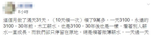 一名木工師傅就抱怨薪水從30年前即開始凍結、不見有成長空間,讓他非常感嘆,只是當師傅亮出薪資袋,卻讓所有網友都傻眼、驚呆了!(圖片翻攝爆廢公社二館)現年28歲的木工師傅日昨在《爆廢公社二館》發文寫道「8月連續31天全都上工,平均1天8小時,但有時會加班到晚上12點,領了9萬多、1天3100(元),永遠的3100,30年前木工薪水也是3100,30年後也是一樣…」,看著平均薪資調高,木工行情卻無成長空間,讓他非常感嘆「我們卻只停留在原地,總是領著微薄薪水,1天過1天…」。
