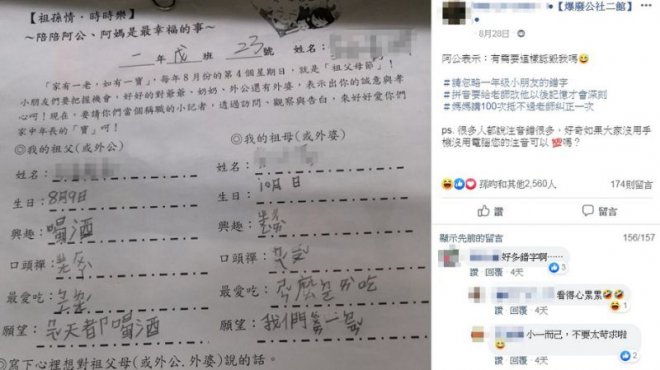 該名媽媽在臉書「爆廢公社二館」發文並PO照,只見孩子這份調查作業中,提到學生回家可透過訪問、觀察等,找出阿公、阿嬤的「生日」、「興趣」、「口頭禪」、「最愛吃」及「願望」,沒想到原PO孩子竟大爆阿公的料,寫下「興趣:喝酒」、「口頭禪:髒話」、「最愛吃:檳榔」、「願望:每天都喝酒」等話,讓原PO看完哭笑不得,直呼「阿公表示:有需要這樣詆毀我嗎!」