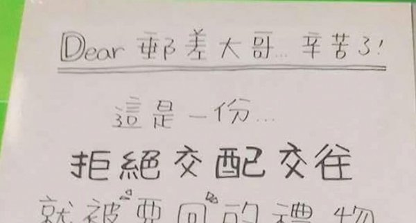 「Dear郵差大哥…辛苦了!這是一份拒絕交往就被要回的禮物,感謝你安全的送達」,