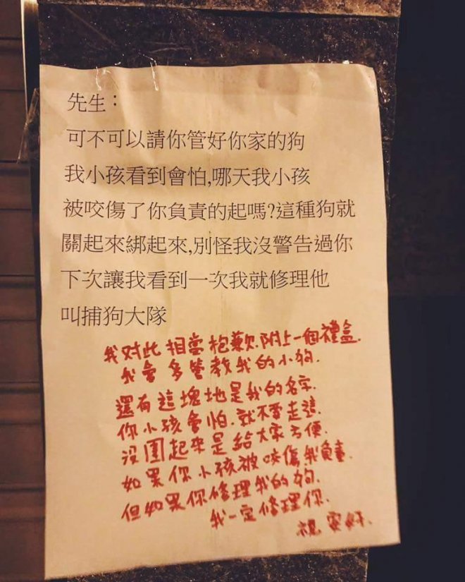 前幾天,一名網友在家門口發現一張紙條,上面的內容讓人很火大:「先生,可不可以請你管好你家的狗?我小孩看到會怕,哪天我小孩被咬傷了你負責的起嗎?這種狗就關起來綁起來,別怪我沒警告過你,下次讓我看到一次我就修理他,叫捕狗大隊!」他立刻回覆,還特…