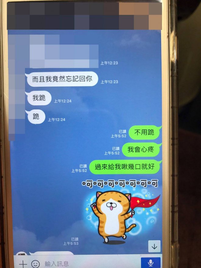請繼續往下閱讀…根據Line截圖,一張是女生傳了一張貓咪貼圖,上頭寫著「說你愛我」,結果男友真的私毫不忌諱,直接回了「我愛你」,其中愛心還是使用表情符號,一顆大大的紅心,隨後兩人就互道晚班。另一張截圖中,女生先是為了忘記回覆訊息道歉,「我跪,跪」;結果男友的回應超曖昧,